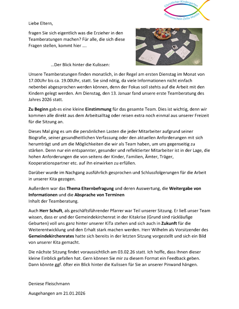 ich danke alle Eltern, die an unserer Befragung im Dezember teilgenommen haben, dank Ihrer Hilfe konnte ich mir, als Leitung, ein Bild von den aktuellen Bedürfnissen und Wünschen der Familien machen. In der Zwischenzeit ist die Auswertung mit dem Team, dem Träger, der Fachberatung und dem Elternbeiratsvorsitz erfolgt. Alle Beteiligten sind stets bestrebt an der Qualität des Hauses zu arbeiten, bitte lassen Sie uns nun jedoch etwas Zeit um die Änderungswünsche in die Tat umzusetzen. Sollten Sie einmal nicht zufrieden sein dürfen Sie auch außerhalb der jährlichen Befragung das Gespräch zu uns suchen.
